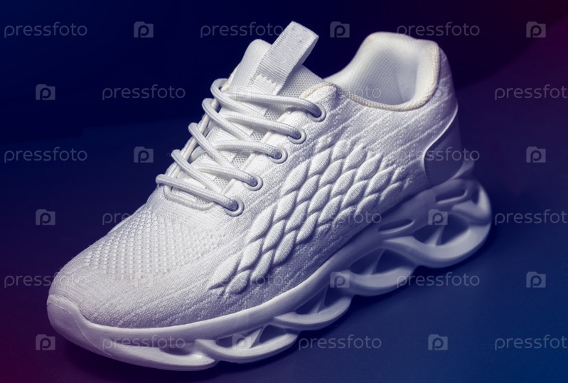 Белые тканевые кроссовки с рельефной витой подошвой на градиентном темно-синем фоне крупным планом