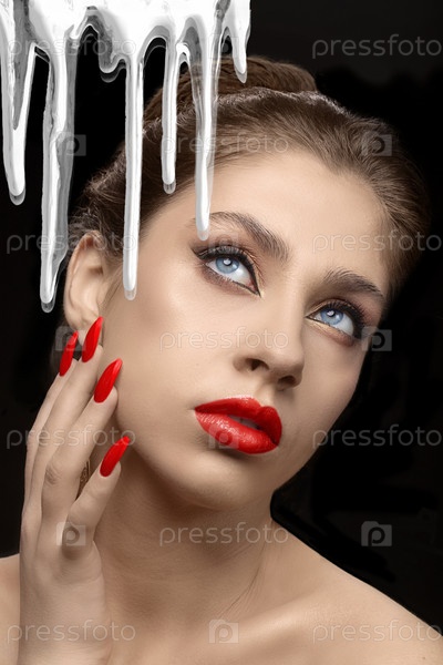 Белый крем для лица растекается на фоне красивой девушки с красными губами и ногтями