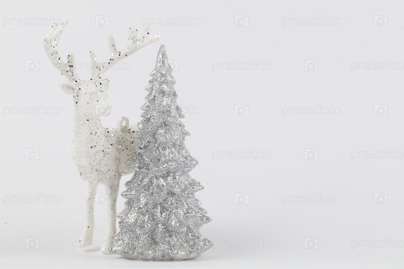 Приглушенный праздничный фон. На сером фоне серебряная елка и белый рождественский олень