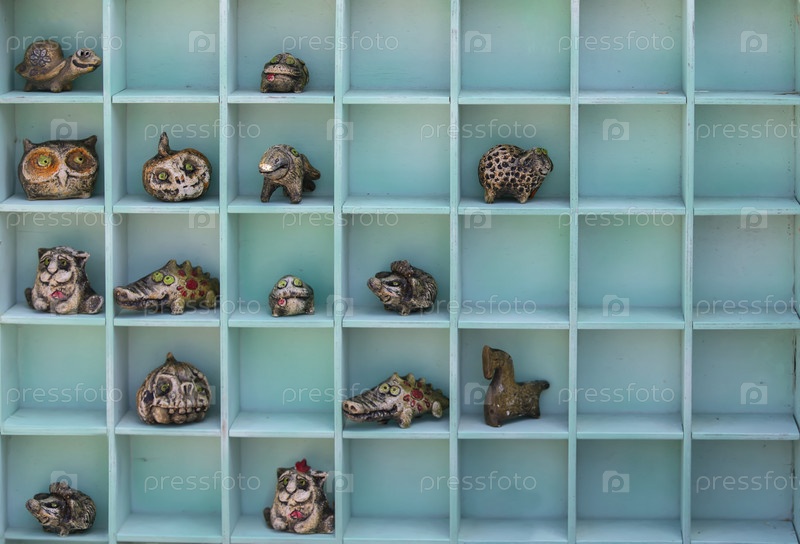 В деревянных ячейках лежат детские глиняные игрушки сказочных животных ручной работы