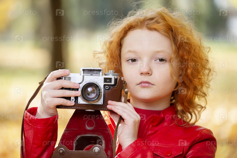 Маленькая рыжеволосая девочка с ретро-камерой на фоне осени. Маленькая рыжеволосая девочка с ретро-камерой на фоне осени. Крупный план лица девочки с винтажной камерой
