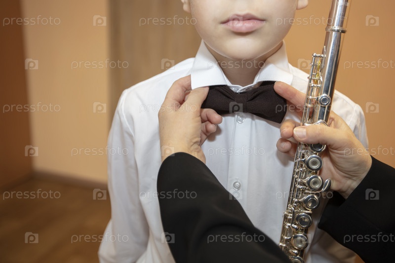 Учитель музыки готовит своего ученика к музыкальному выступлению. Он поправляет ему галстук-бабочку