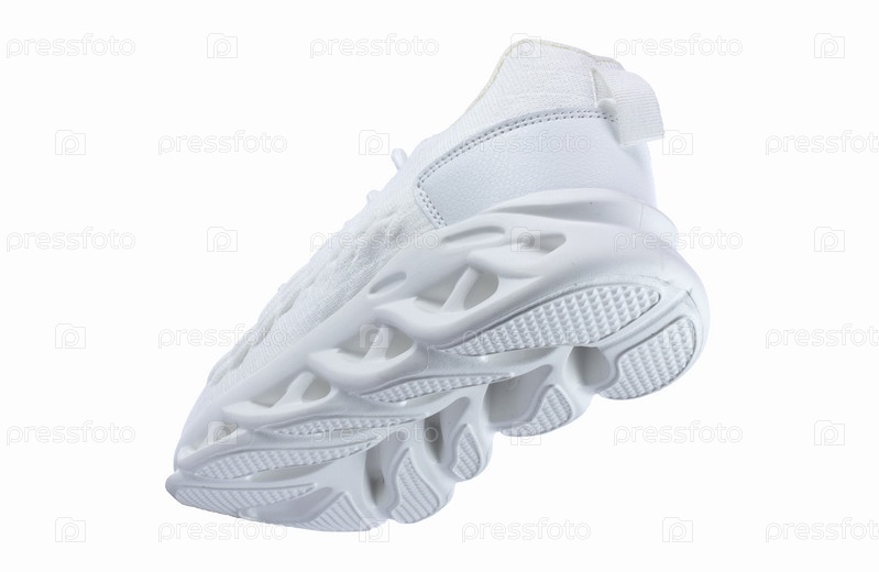Белые спортивные кроссовки с рифленой подошвой на белом фоне