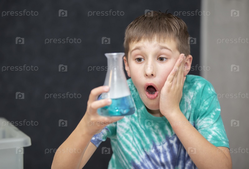 Новые научные открытия. Умный мальчик-ученый кричит от удивления, проводя химические эксперименты в лаборатории. Концепция образования. Открытие