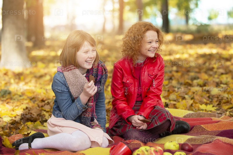 Две подружки в осеннем парке на пикнике. Дети осенью