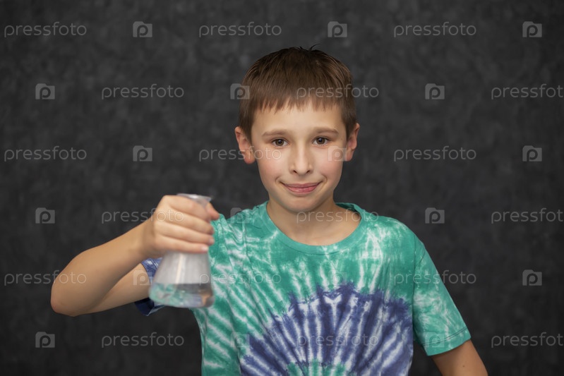 Мальчик держит в руке стеклянную химическую колбу