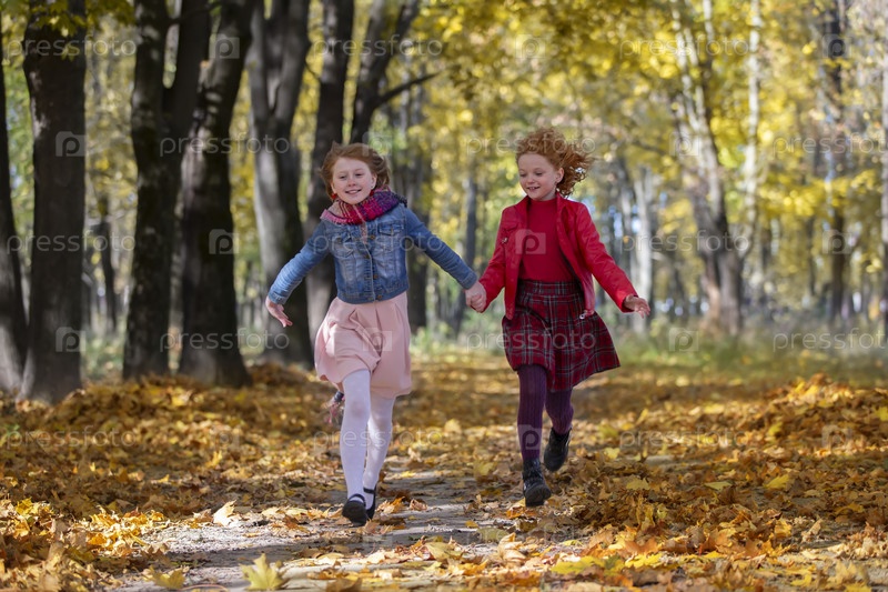 Счастливые дети играют в осеннем парке теплым солнечным осенним днем