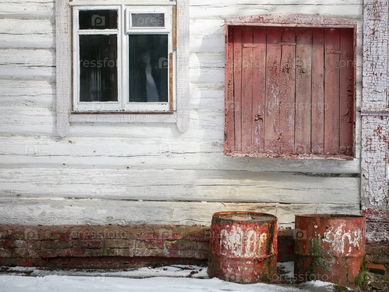 Фон старого и заброшенного дома. Деревянная стена с облупившейся краской и ржавыми бочками