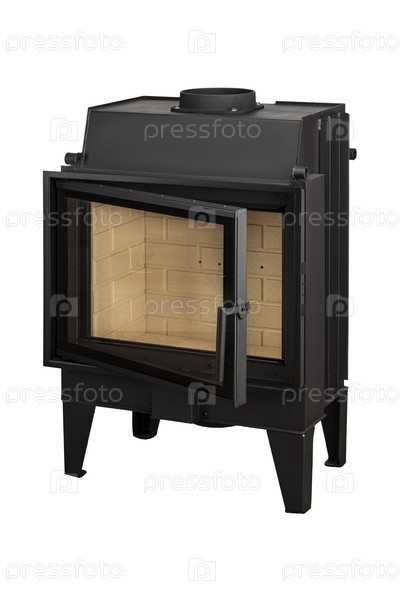 Современные камины для отопления из металла и жаропрочного стекла. Котел на твердом топливе изолирован на белом фоне