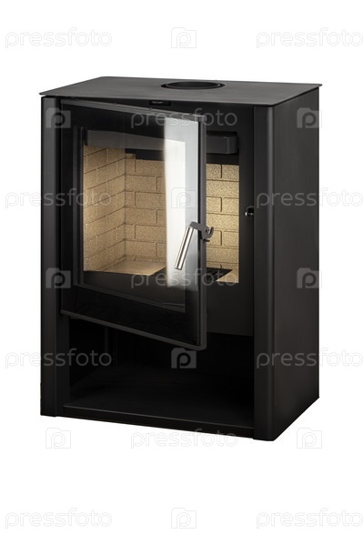 Современные камины для отопления из металла и жаропрочного стекла. Котел на твердом топливе изолирован на белом фоне