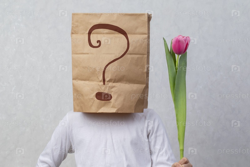 Анонимный мужчина с коробкой на голове, ограничивающей его личность, держит цветок. Скрытые эмоции. Подарок от незнакомца