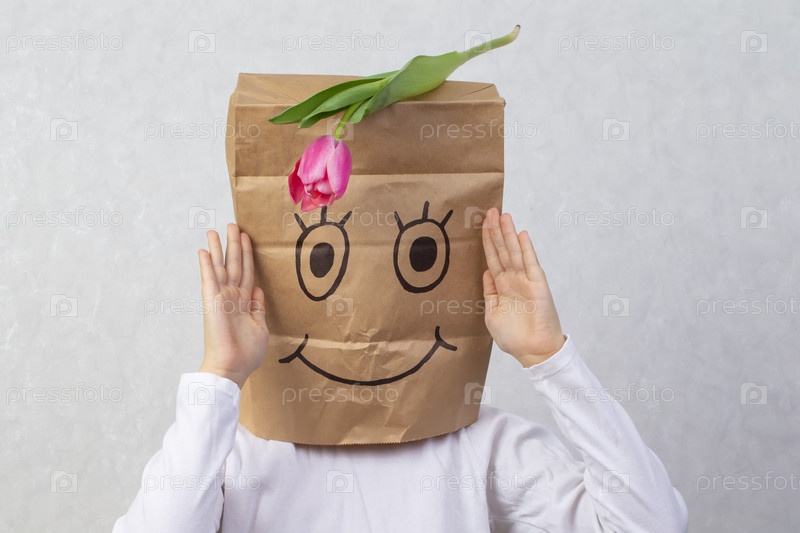 Над головой у мальчика картонная коробка с нарисованным на ней смешным смайликом. Тюльпан сверху