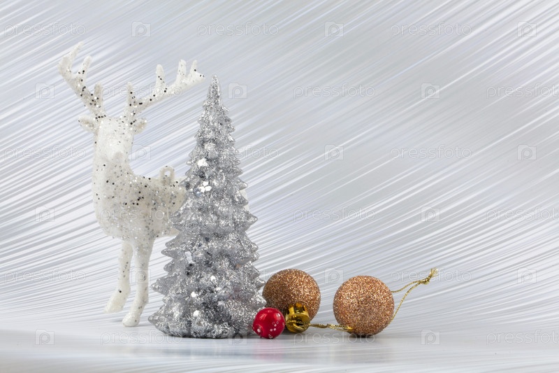 Рождественский или новогодний фон с серебряной заснеженной елкой и золотым переходным украшением, оленями. Яркий праздничный фон