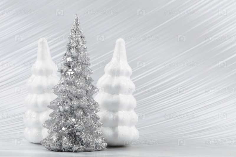 Рождественский или новогодний фон с серебристой заснеженной елью. Яркий праздничный фон