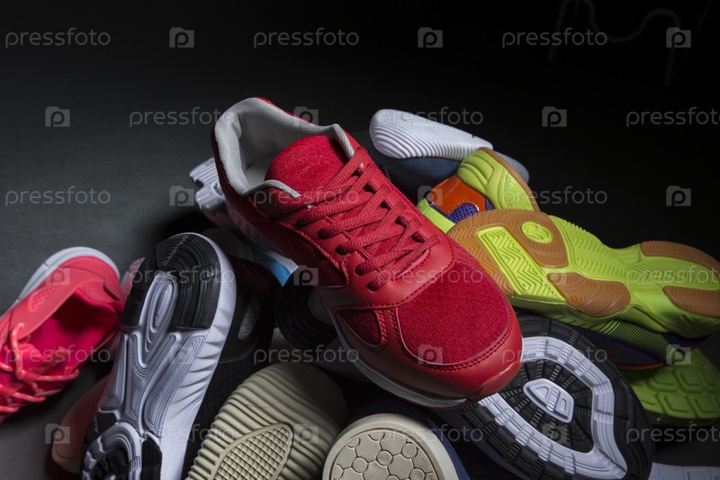 Разноцветные кроссовки сложены стопкой на сером фоне. Спортивная обувь