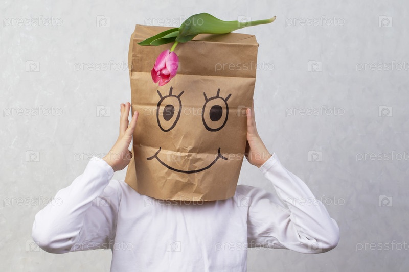 Ребенок нарисовал улыбку на бумажном пакете и надел его себе на голову. Концепция анонимного подарка