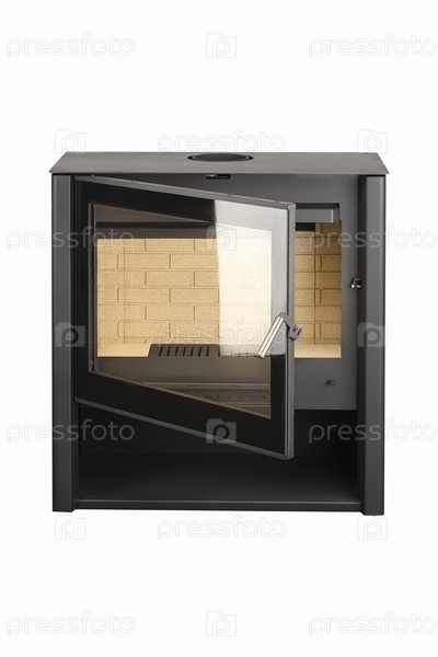 Современные камины для отопления из металла и жаропрочного стекла. Котел на твердом топливе изолирован на белом фоне