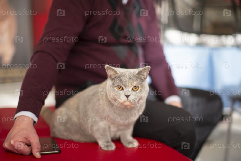 Британский кот с желтыми глазами смотрит в камеру