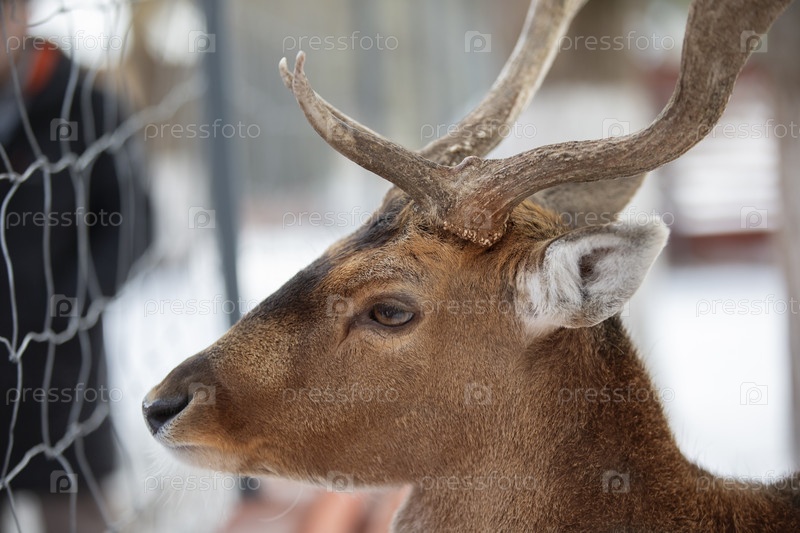Морда оленя с рогами за сеткой вольера крупным планом