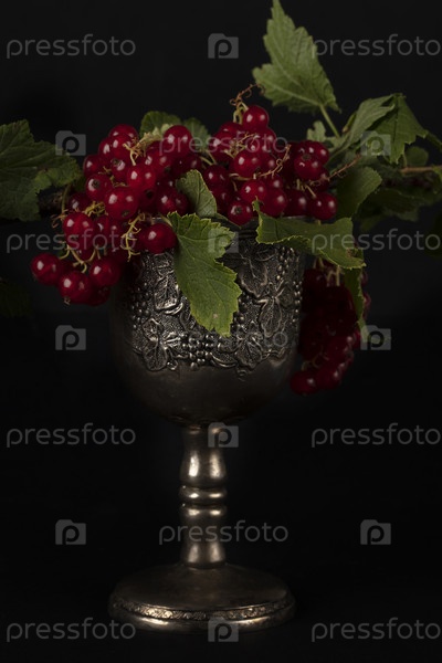 Ягоды красной смородины в роскошном старинном бокале на темном фоне. Натюрморт с ягодами в стиле восемнадцатого века