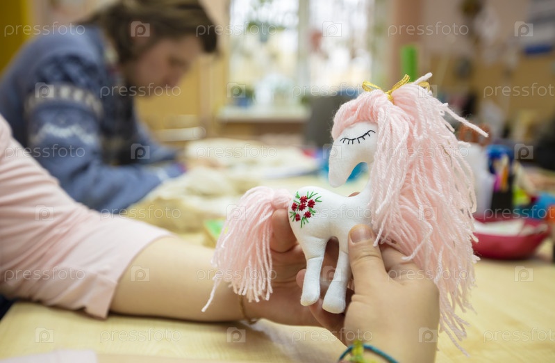 Игрушечная самодельная розовая лошадка в руках мастера