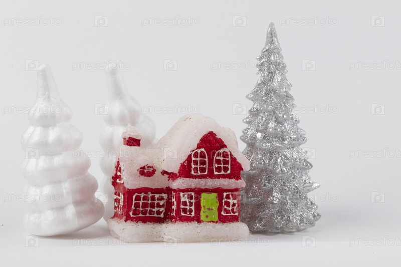 Рождественская сцена, миниатюрный дачный поселок. Рождественские маленькие красные домики, олени и заснеженные ели на белом фоне. Праздничные современные украшения