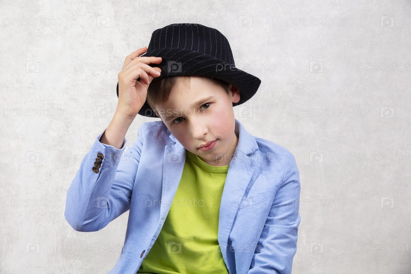 Элегантный мальчик в костюме и черной шляпе смотрит в камеру