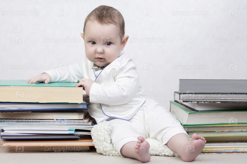 Маленький ребенок среди книг. Счастливый шестимесячный мальчик в стопке книг. Концепция раннего образования детей