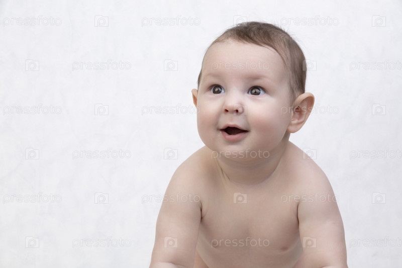 Шестимесячный ребенок на белом фоне. Счастливый мальчик в середине диапазона. Концептуальное фото отцовства и материнства. Альфа-поколение