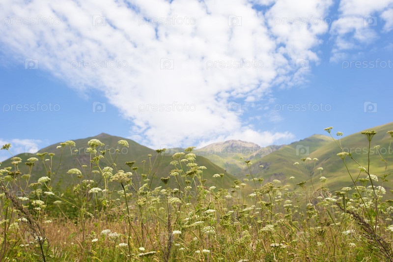 Горный пейзаж. Красивые горы и луга на фоне голубого неба