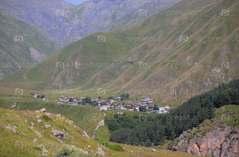 Красочный пейзаж с высокими горами, красивая извилистая дорога, зеленый лес, маленькая деревня. Горная долина. Путешествие в Грузию