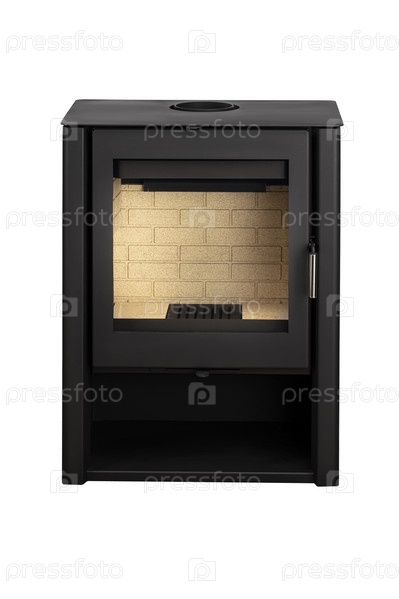Современные камины для отопления из металла и жаропрочного стекла. Котел на твердом топливе изолирован на белом фоне