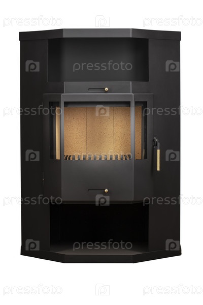 Современные камины для отопления из металла и жаропрочного стекла. Котел на твердом топливе изолирован на белом фоне