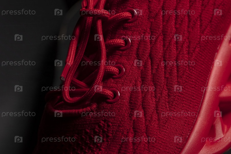 Часть красного тканевого кроссовка на черном фоне крупным планом. Текстильная обувь