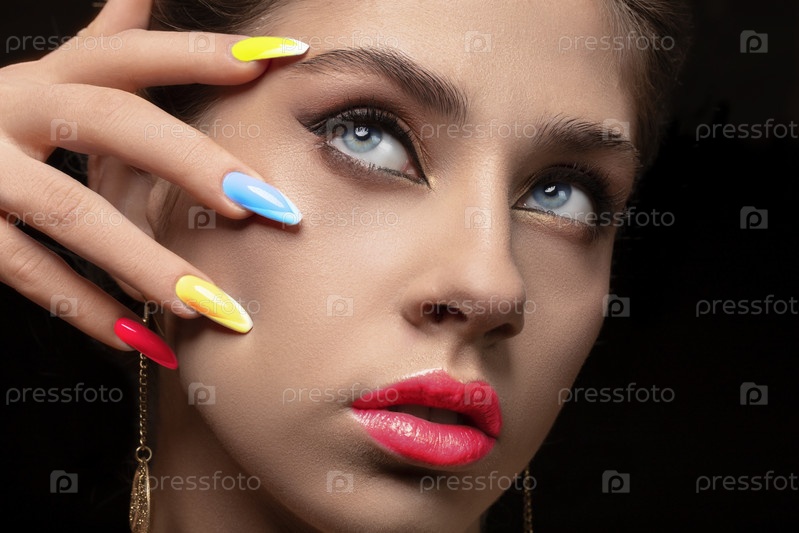 Портрет девушки красоты с ярким макияжем и красочным радужным лаком для ногтей. Красочные ногти