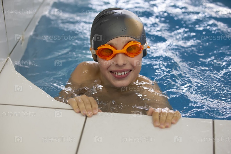 Мальчик в шапочке для плавания и очках в бассейне. Он улыбается и смотрит в камеру. Ребенок в спортивном бассейне