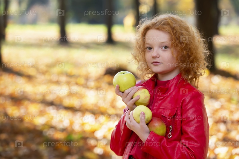 Красивая рыжеволосая девушка в осеннем парке держит яблоки