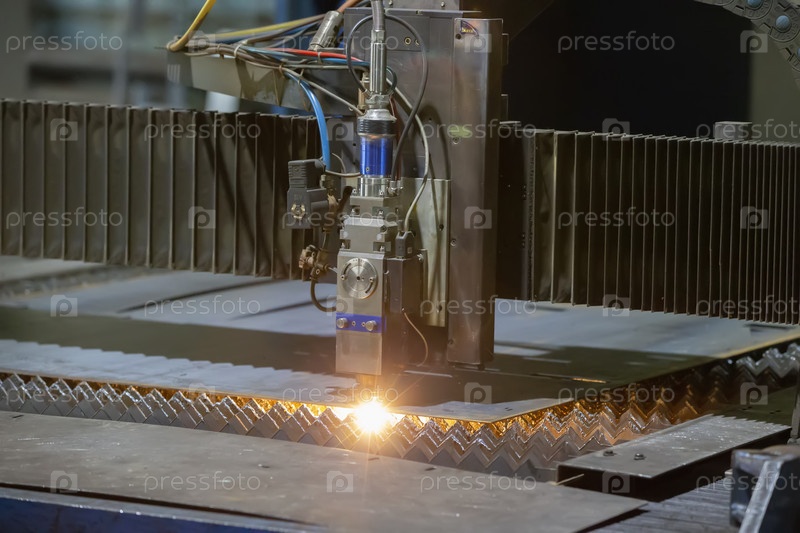 Резка металла. Искры летят от лазера. Лазерный станок для резки листового металла с искрами на заводе, фабрике