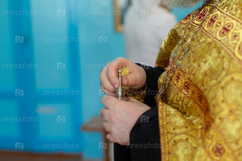 В руках православного священника флакон с миррой для обряда крещения