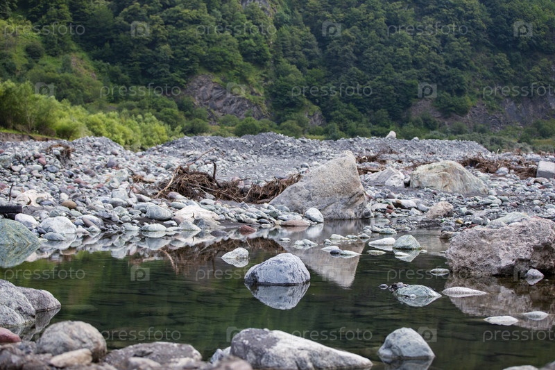 Горная река на фоне булыжников и камней