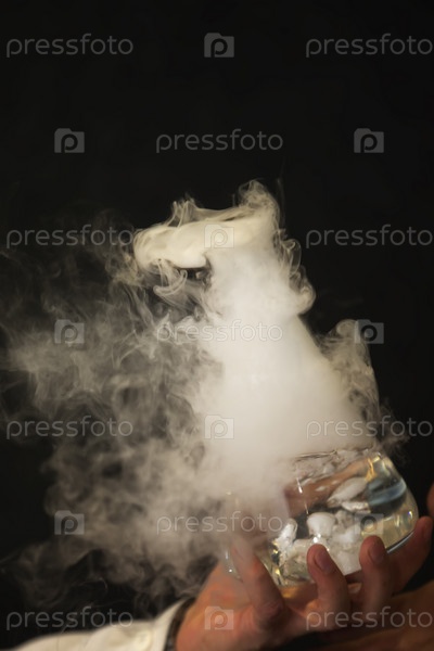 Стеклянная колба с клубами дыма в результате реакции жидкого азота. Научные химические эксперименты