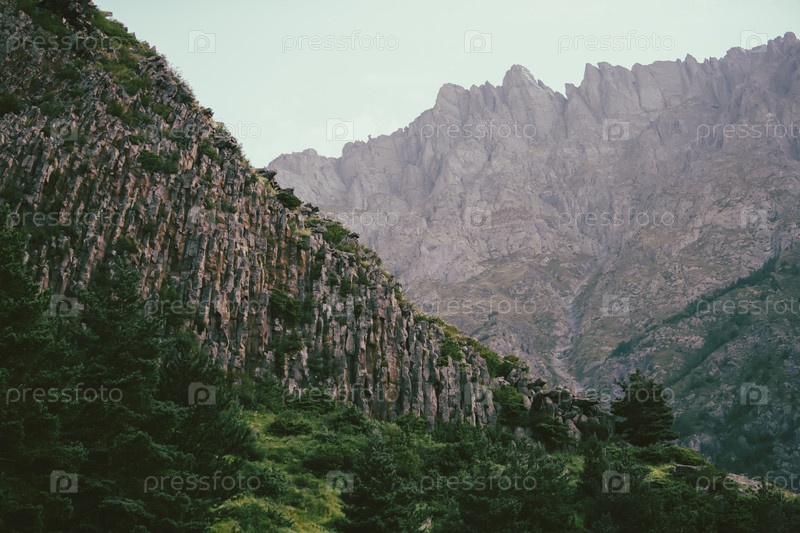 Зеленые ели на фоне скалистых гор Грузии