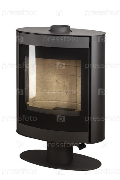 Современные камины для отопления из металла и жаропрочного стекла. Котел на твердом топливе изолирован на белом фоне