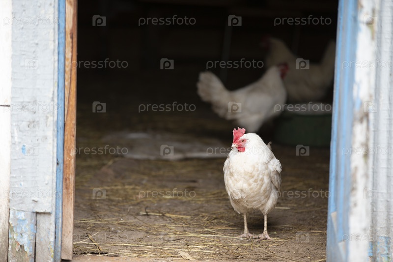 Белая курица гуляет по двору, наслаждаясь жизнью