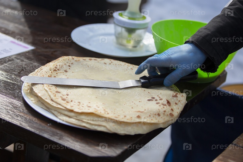 Вылейте тесто для блинов на сковороду. Приготовьте блины
