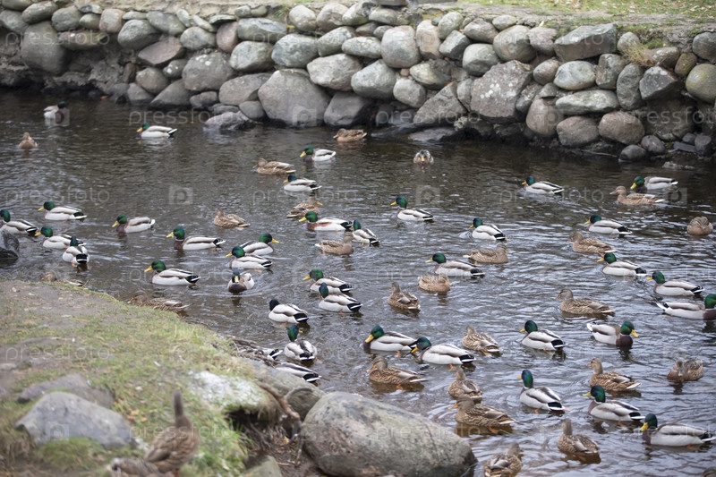 В воде водохранилища плавает множество уток