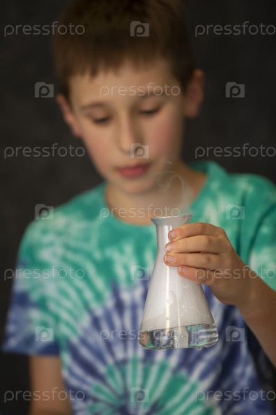 Мальчик проводит научный химический эксперимент с жидким азотом. Ребенок со стеклянной колбой, наполненной дымом