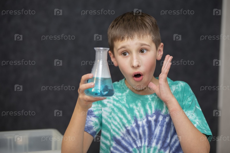 Новые научные открытия. Умный мальчик-ученый кричит от удивления, проводя химические эксперименты в лаборатории. Концепция образования. Открытие