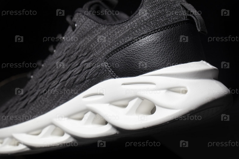 Черные тканевые кроссовки с белой подошвой на черном фоне