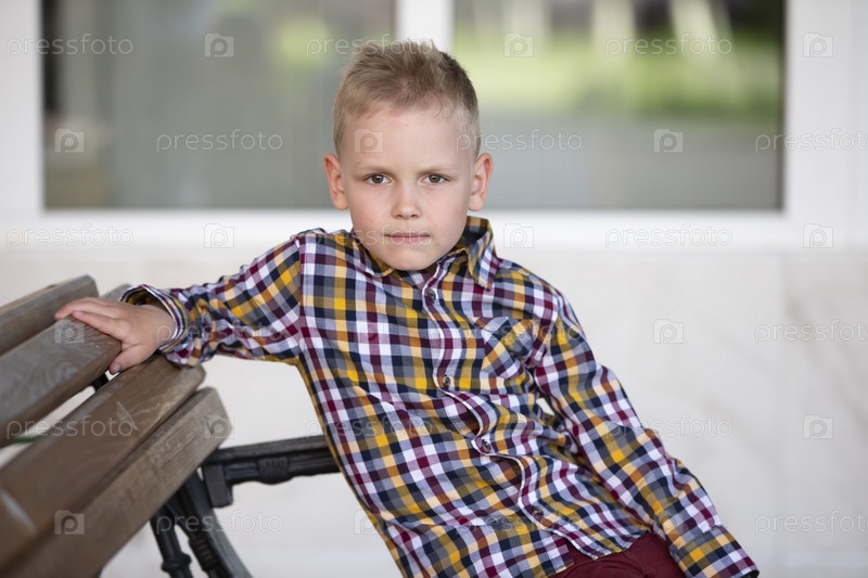 Симпатичный парень европейской внешности сидит на скамейке и смотрит в камеру